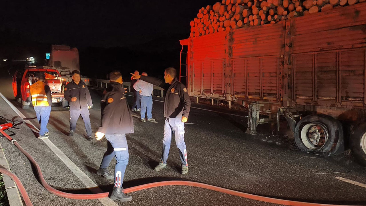 Muğla çevre yolunda seyir halinde olan tomruk yüklü bir TIR, lastiklerinde başlayan yangın itfaiye ekiplerinin zamanında müdahalesi ile tomruklara ve çevreye sıçramadan söndürüldü.